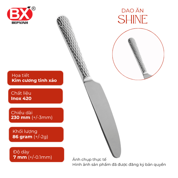 Dao ăn SHINE được chế tác từ inox 420, loại thép không gỉ có hàm lượng carbon cao giúp lưỡi dao sắc bén, cứng cáp và bền hơn so với các dòng inox thông thường. Đây là loại inox chuyên dùng cho dao – vừa đảm bảo độ sắc, vừa giữ được độ sáng bóng sang trọng cho bàn ăn.