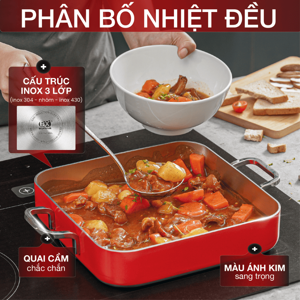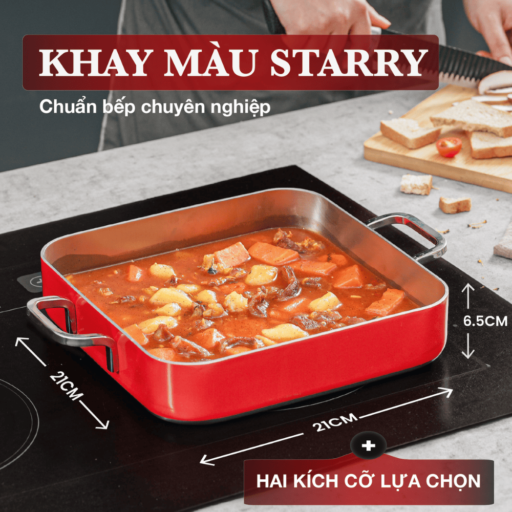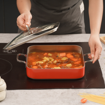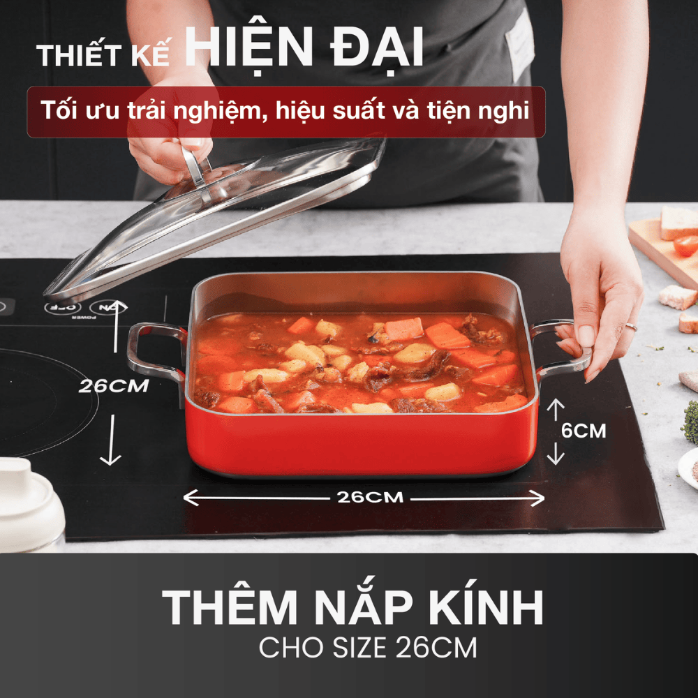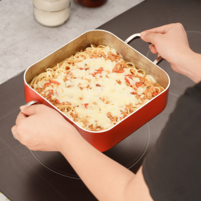 Thiết kế vuông tiện lợi cho pasta, lasagna, thịt hầm, món nướng phô mai hoặc chế biến trực tiếp trên bếp rồi chuyển vào lò nướng.