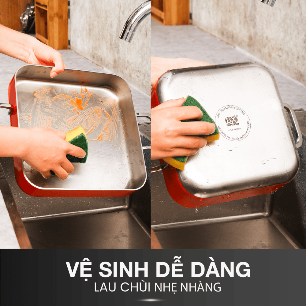 Dùng miếng bọt biển mềm, tránh búi sắt hoặc vật cứng gây trầy xước.