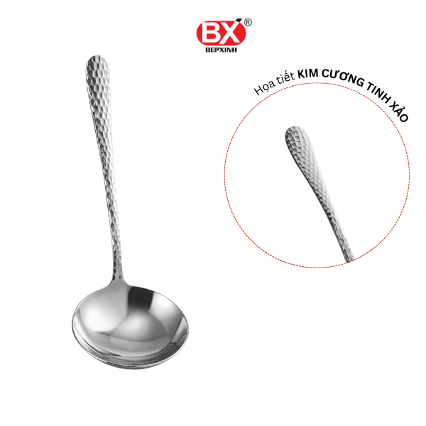 Vá canh nhỏ Kim Cương SHINE được sản xuất từ inox 304 nguyên khối, sáng bóng và an toàn cho sức khỏe. Điểm nhấn của sản phẩm nằm ở họa tiết dập nổi dạng kim cương trên thân và cán vá, tạo hiệu ứng ánh sáng đẹp mắt và mang lại cảm giác sang trọng, khác biệt so với các loại vá thông thường.